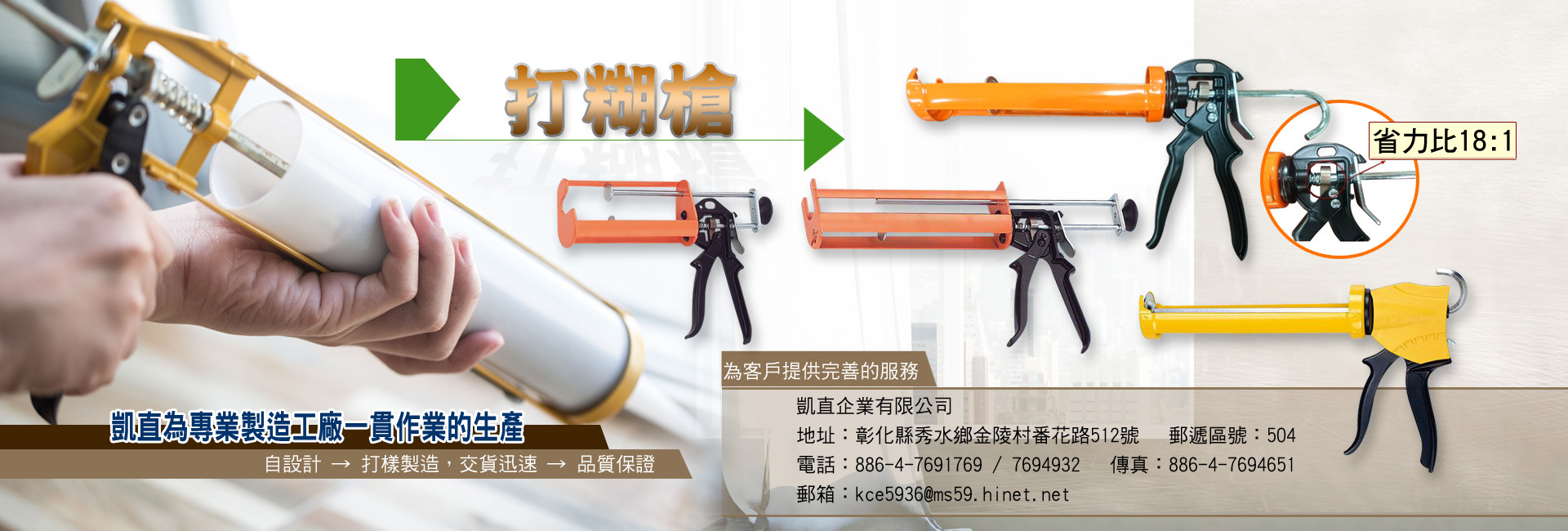 敝公司自1976年成立以來,一直以生產打糊槍為專業製造工廠,為一貫作業的生產,自設計、打樣製造,交貨迅速、品質保證。1995年陸續開發打糊槍、矽膠槍、膠槍、四角架、鐵管衛浴配件,為客戶提供完善的服務。
